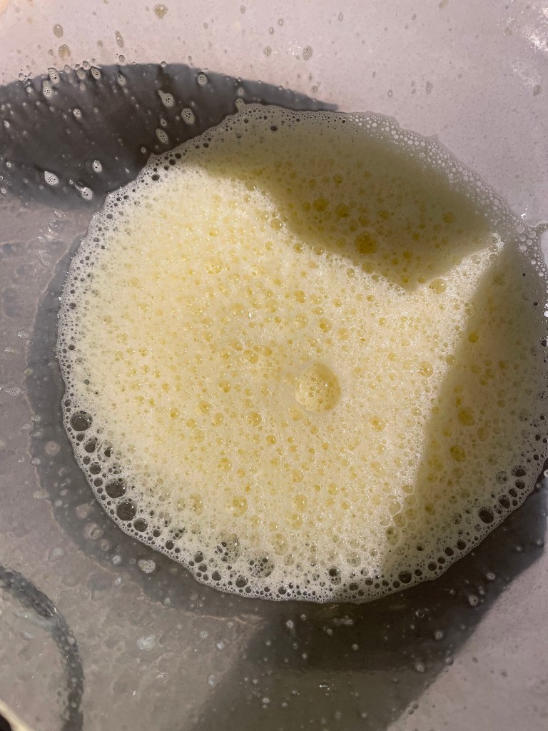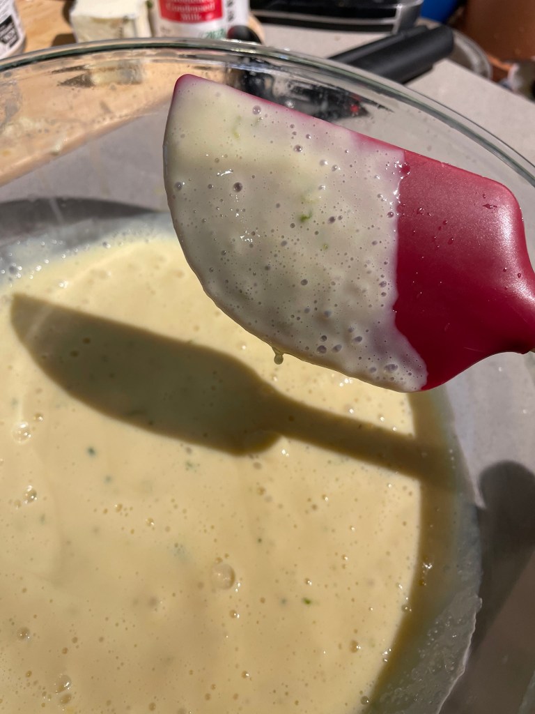 3. As the crust was baking, I started on the filling and THAT’s where everything went wrong. I was supposed to mix the eggs with the zest of the lime. I accidently read it wrong and mixed the egg with all the key lime zest and the juice. That’s why it’s all frothy. I kept waiting for my mixture to look like the one in the video. Alas, it did not happen. 😦